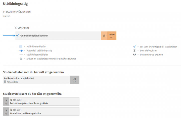 För studier som inte leder till examen visar utbildningsstigen endast studiernas typ och omfattning. Studiehelheter och studieavsnitt som du har rätt att genomföra visar studier som inkluderas i utbildningen. Om studierna har en begränsad prestationstid som avviker från studierättens giltighetstid, visas detta i statusfältet under helheten och avsnittet.