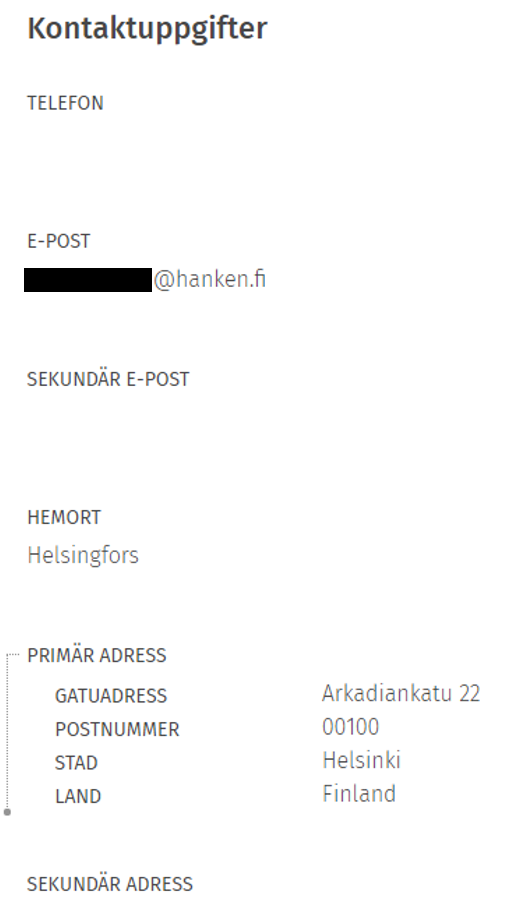 I kontaktuppgifterna ser du om uppgifterna har en spärrmarkering. Spärrmarkerade kontaktuppgifter importeras inte till Sisu och syns därför inte i systemet. Ifall du har en spärrmarkering ska du informera Hanken om det med ett intyg från Myndigheten för digitalisering och befolkningsdata så för vi in det i Sisu.