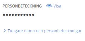 Genom att klicka på Visa intill personnumret ser du din nuvarande personbeteckning som registrerats i systemet. Genom att klicka på Tidigare namn och personbeteckningar ser du dina gamla uppgifter som varit i kraft medan du varit inskriven vid universitetet.
