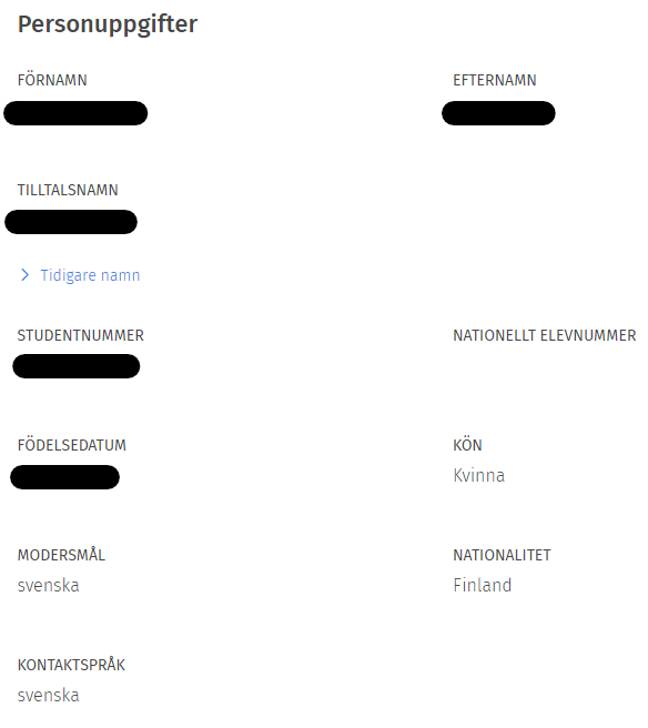 Här ser du dina personuppgifter. Du kan inte själv redigera dina personuppgifter, kontakta studieservicen ifall dina personuppgifter ska uppdateras. Om dina kontaktuppgifter ändras (t.ex. din hemadress) ska du uppdatera dem själv i Sisu.