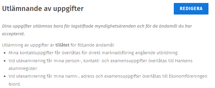 Här kan du bestämma för vilka ändamål dina kontaktuppgifter kan utlämnas från studeranderegistret. Genom att klicka på Redigera får du bestämma över utlämnandet av dina uppgifter. När du har definierat utlämningsvillkoren, klicka på Spara. Hemliga kontaktuppgifter utlämnas inte