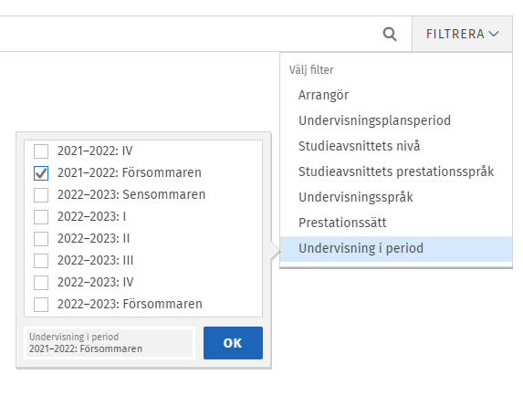 Du hittar de kurser som ges i början av sommaren via följande filter på Sök-sidan:
