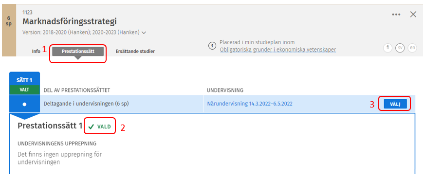 Klicka antingen på Sätt 1 eller Sätt 2 beroende din studieort. Ifall prestationssättet heter Helsingfors&Vasa är undervisningen inom det prestationssättet öppet för båda studieorterna.