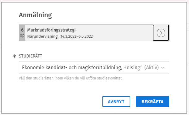 I popup-fönstret ser du villkoren för anmälan och undervisningstiderna. Ifall du har flera aktiva studierätter ska du välja den studierätten vars studieplan du placerat studieavsnittet i. Ifall anmälan har tilläggsfrågor ska du besvara dem.