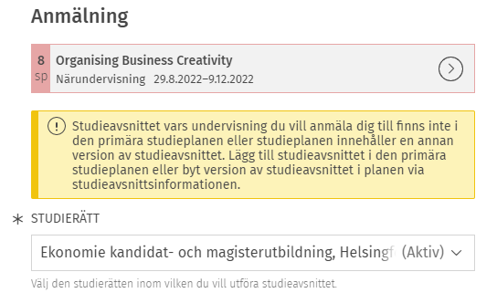 Du måste alltid lägga till studieavsnittet i din studieplan före du anmäler dig, annars kommer din anmälan inte att godkännas.