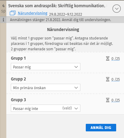 I vissa fall kan deltagarna väljas till undervisningen i den ordning som de anmält sig. I detta fall får du en bekräftelse av en plats på undervisningen genast efter att du anmält dig: ”Du har blivit godkänd till undervisningen/Du blev inte vald till undervisningen”. Du känner också igen denna typ av anmälan från ikonen vid undervisningsgrupper som visar antalet platser. Antalet cirklar i ikonen och färgen på dem är alltid samma och återspeglar inte antalet platser i undervisningen.