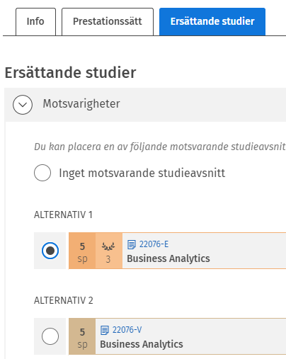 • Exempel: Du har utfört Strategic Thinking 22025-E, och huvudämneshelheten 2023-2025 innehåller Strategic Thinking 22025 (utan E). Välj då 22025-E som en motsvarighet för 22025.