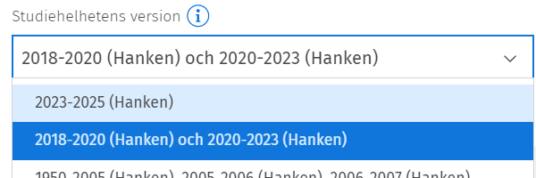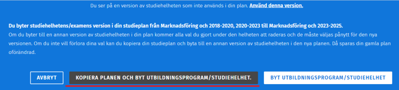 • Byt inte helhetens version till 2023-2025, byt endast versionen på de studieavsnitt du inte ännu utfört till 2023-2025.