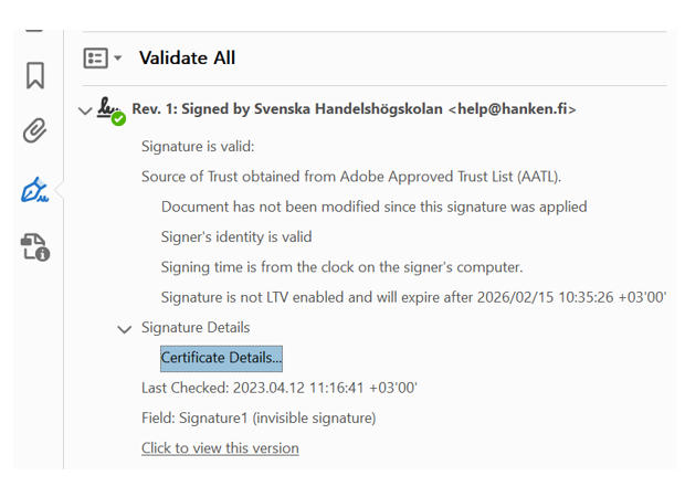 - Kontrollera uppgifterna. Ett dokument från Svenska handelshögskolan har en elektronisk underskrift om du hittar följande uppgifter i pdf-dokumentets Summary-flik: