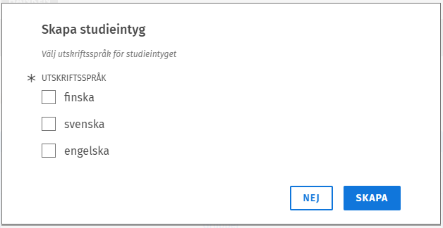 2. Välj vilket/vilka språk du vill ha intyget på. Du kan välja flera språk om du vill, då får du ett intyg per språk. Klicka på Skapa för att skapa studieintyget.